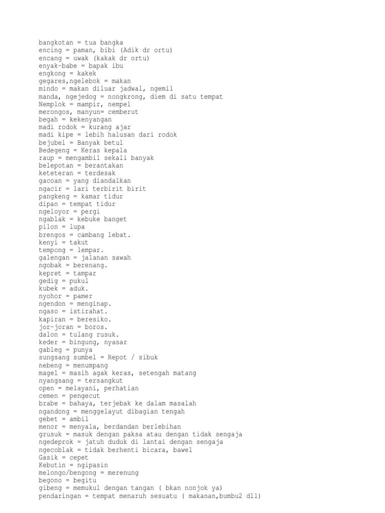 Bahasa betawi dikenal dengan logatnya yang khas dan juga pelafalan dari. Awang itu berarti males gan. Berikut ini adalah daftar beberapa kata dalam bahasa betawi beserta artinya. Kosakata kamus bahasa betawi secara elektronik,dapat menampilkan arti dari kosakata bahasa betawi. Artinya kebebasan dan faktor alam sangat berperan, misalnya dalam mengungkapkan bunyi ayam berkokok.